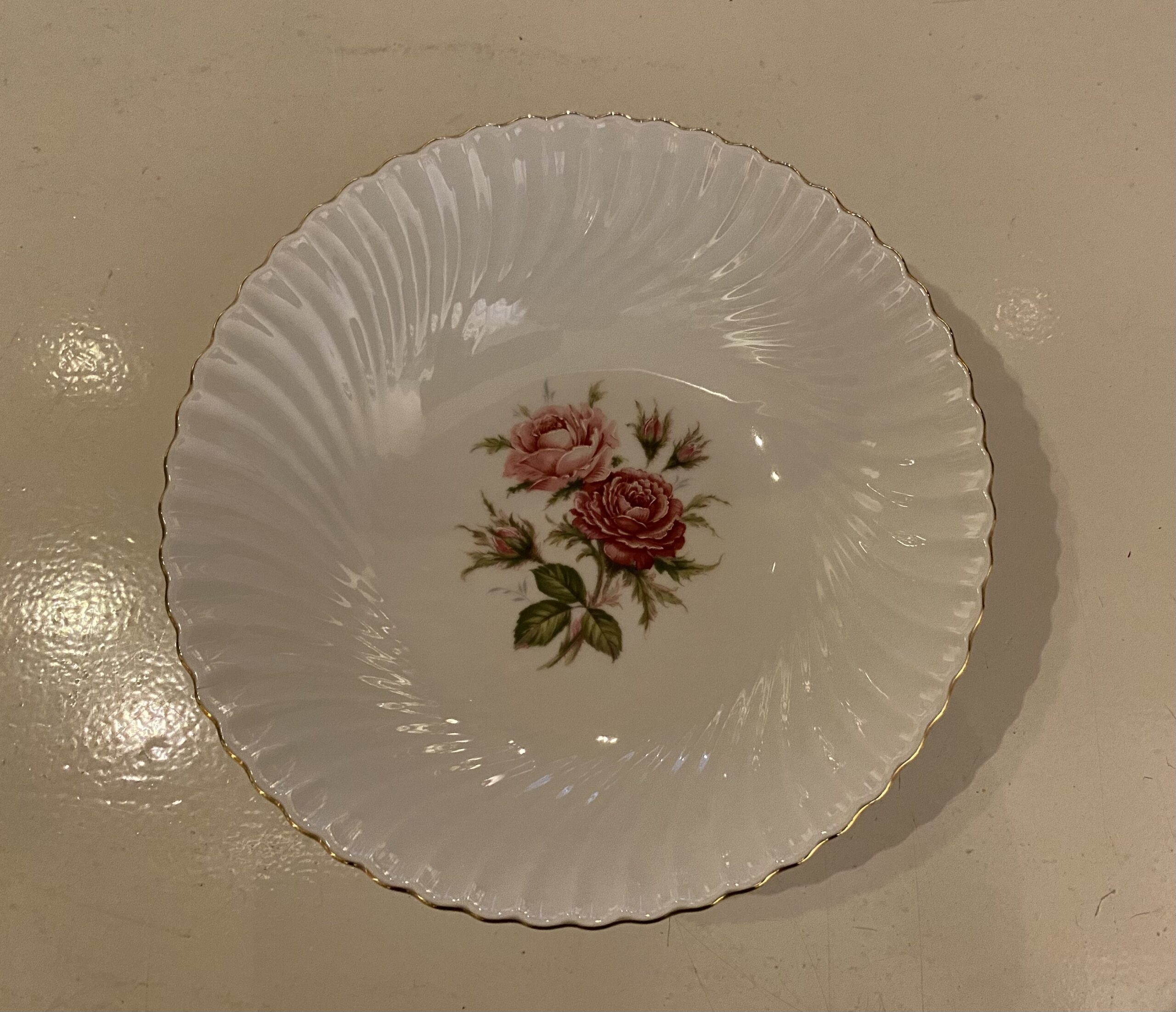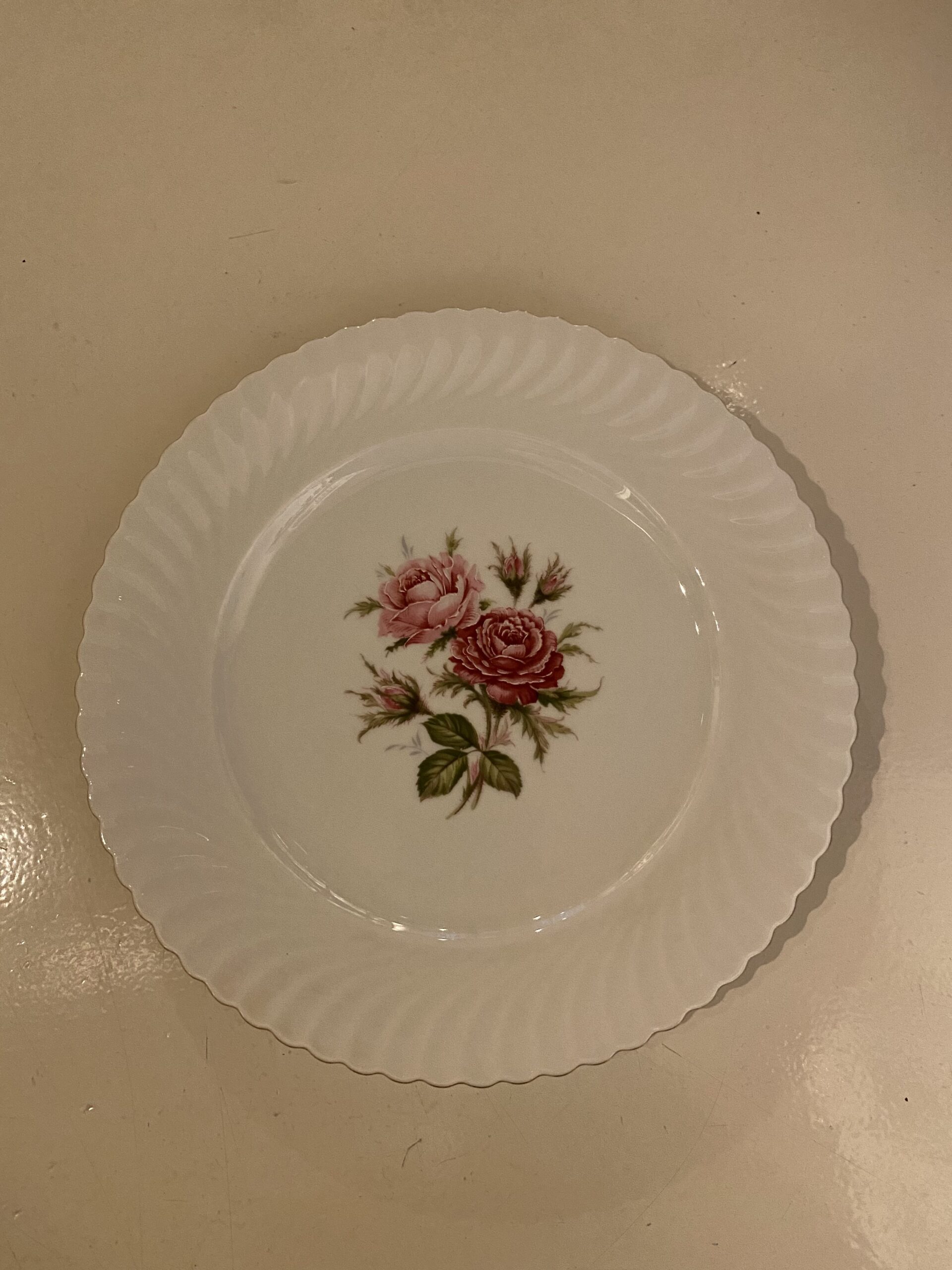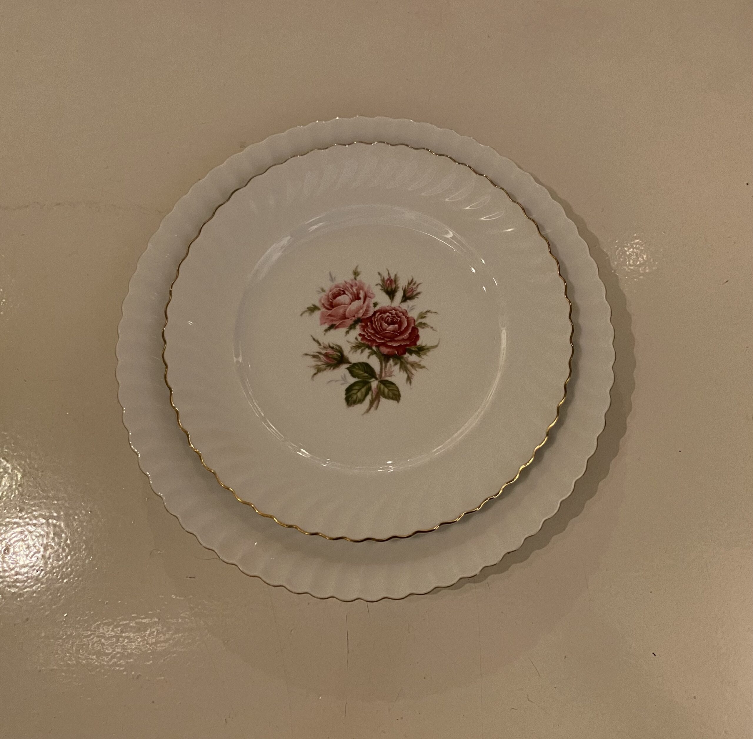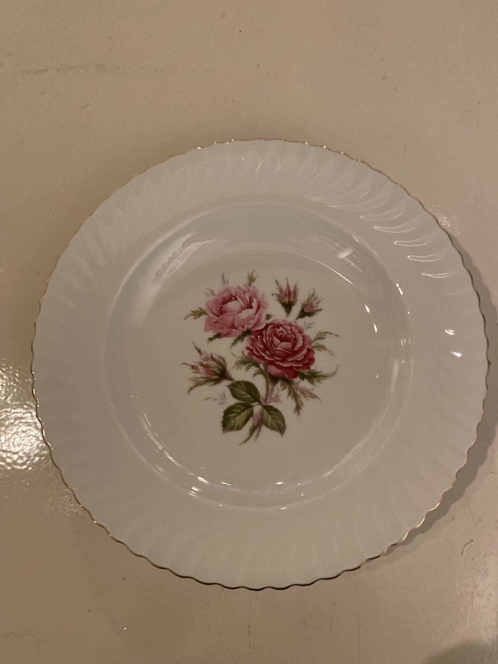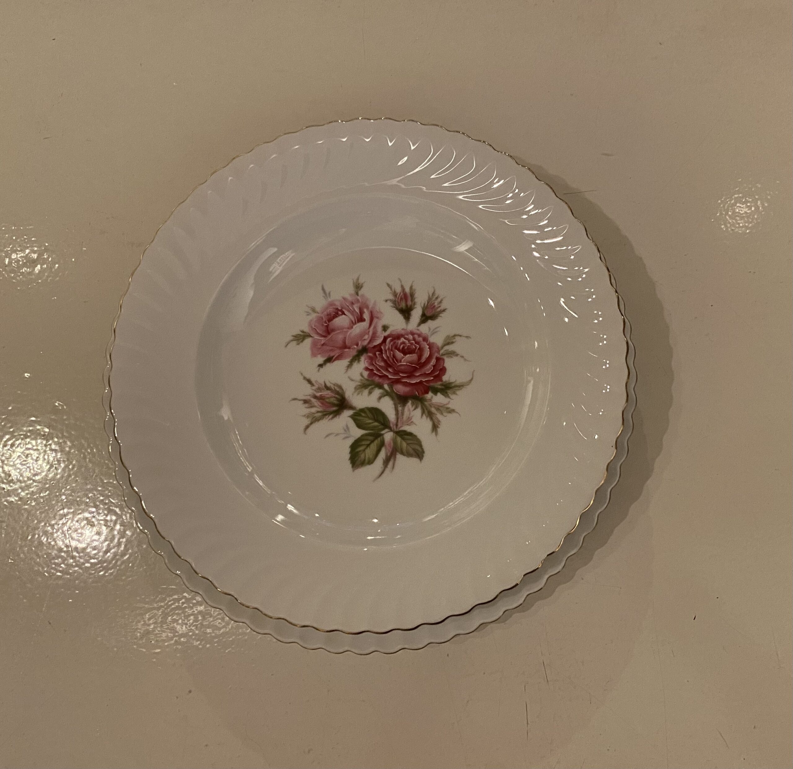 De items zijn beschilderd met een rozentak in het midden en de getande rand van de borden hebben een fijn reliëf en zijn afgewerkt met een gouden randje.