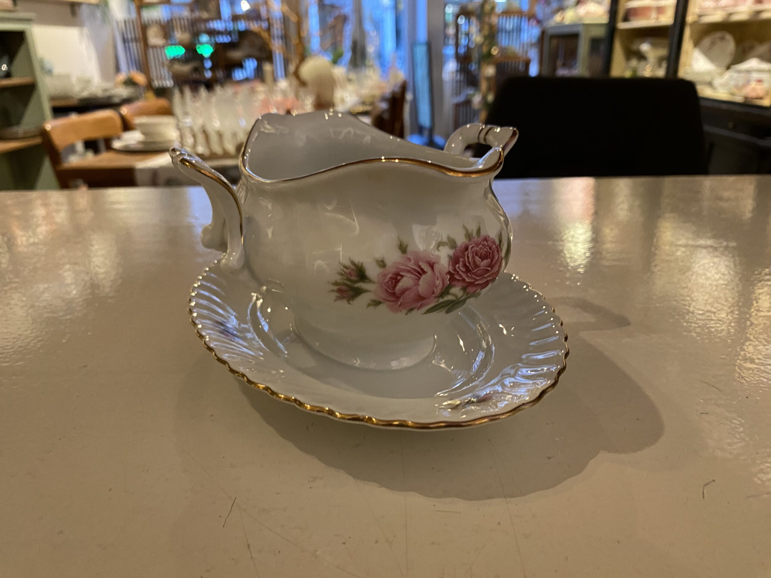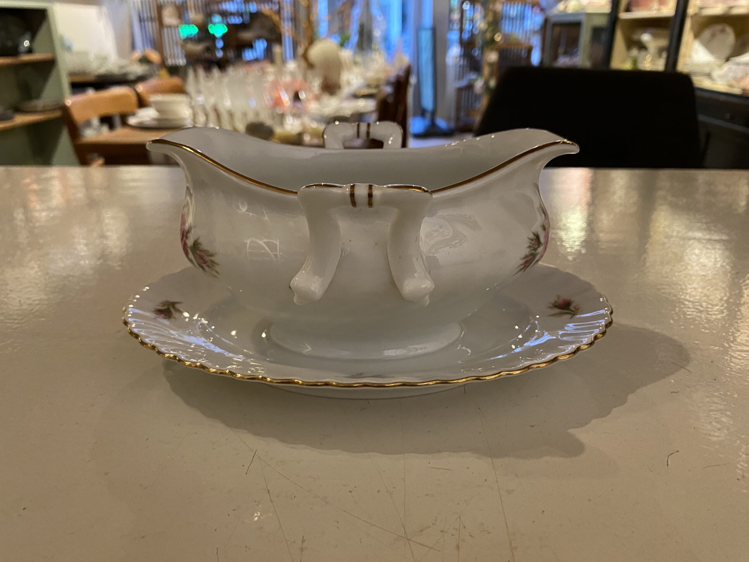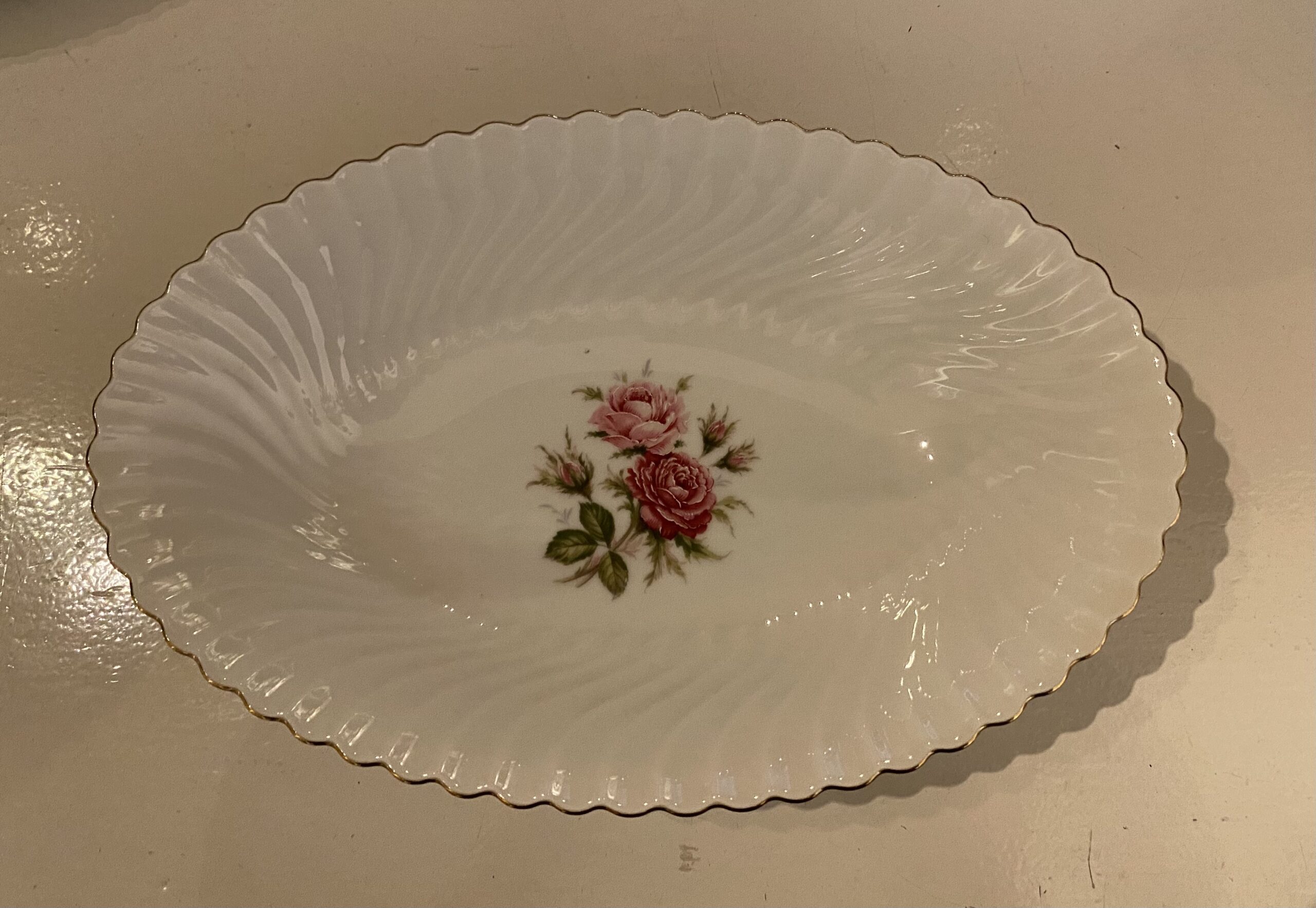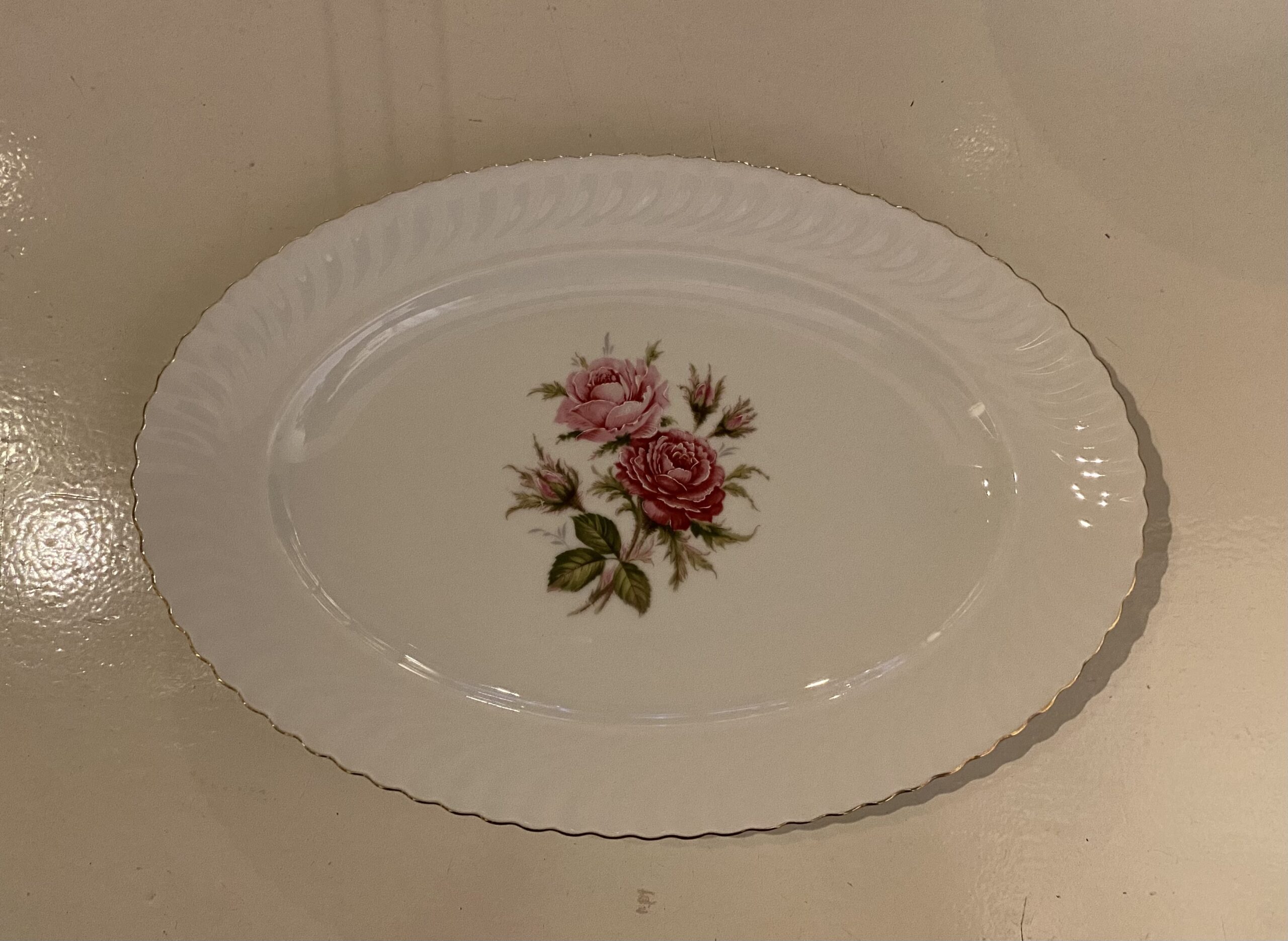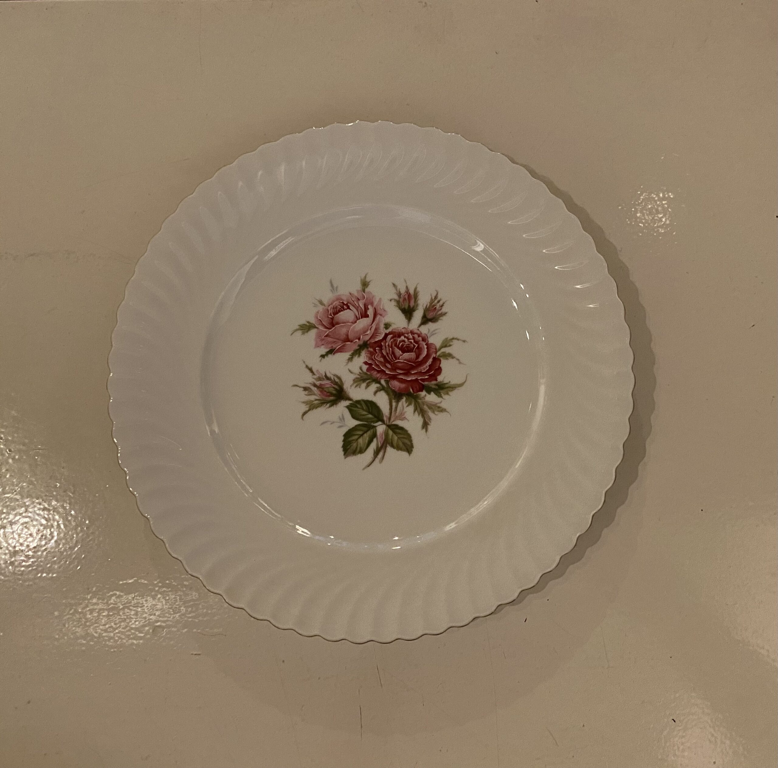 De items zijn beschilderd met een rozentak in het midden en de getande rand van de borden hebben een fijn reliëf en zijn afgewerkt met een gouden randje.
